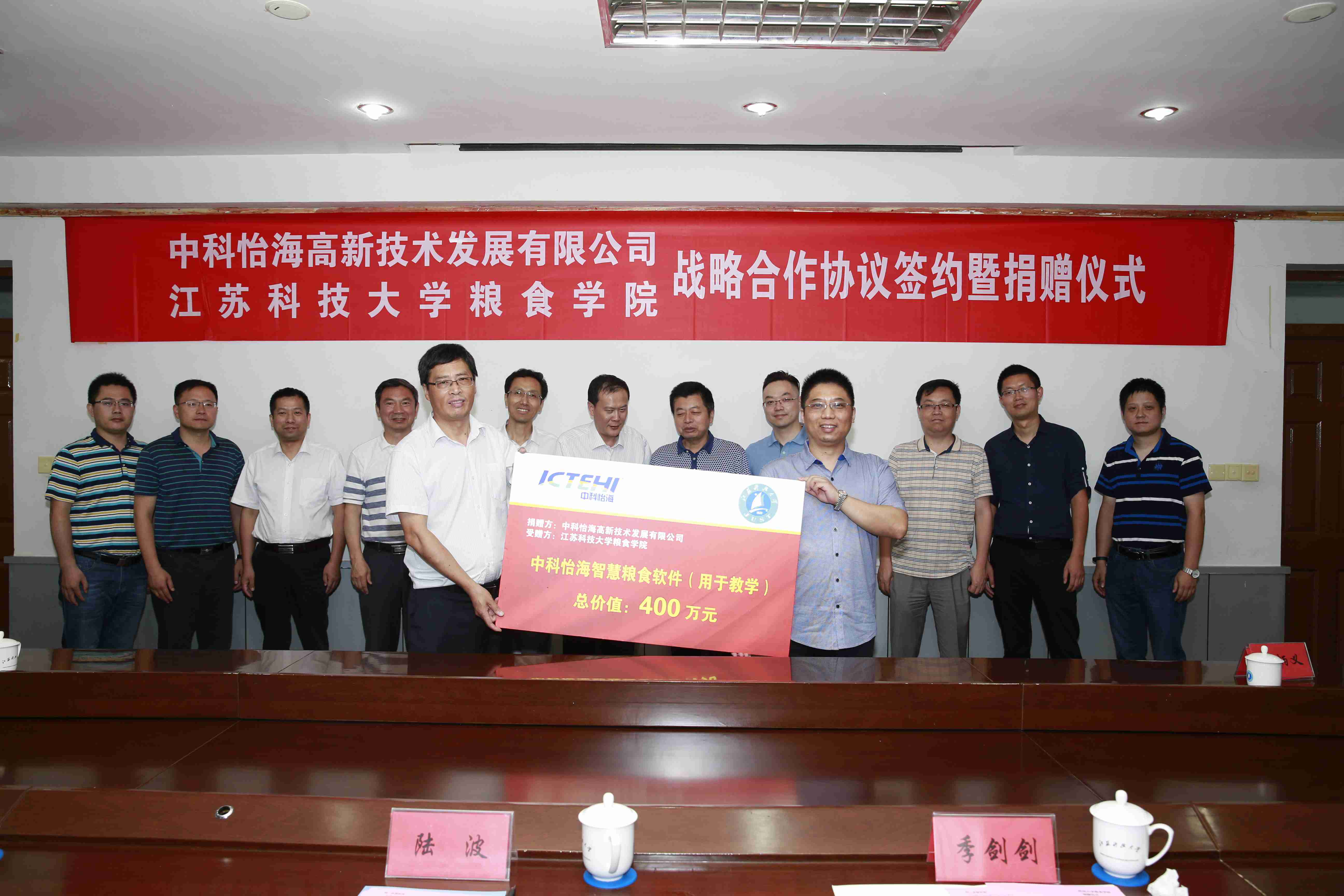 中科怡海高新技术发展有限公司向太阳集团tcy8722捐赠总价值400万“智慧粮食软件”。汤建副董事长代表公司向中科怡海高新技术发展有限公司董事长陆波颁发捐赠赠书。