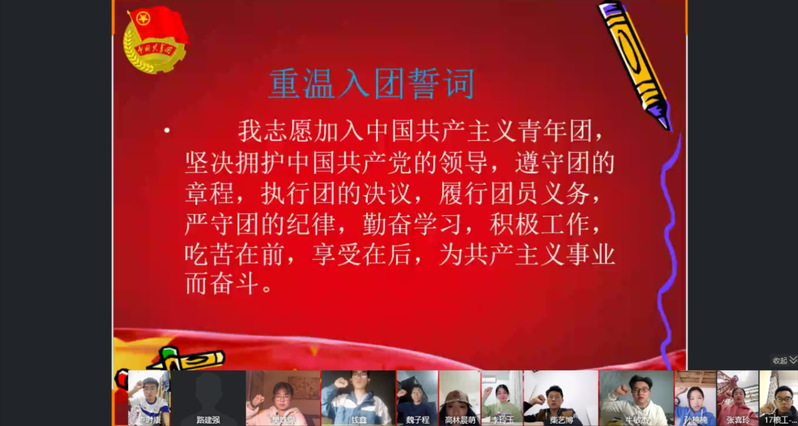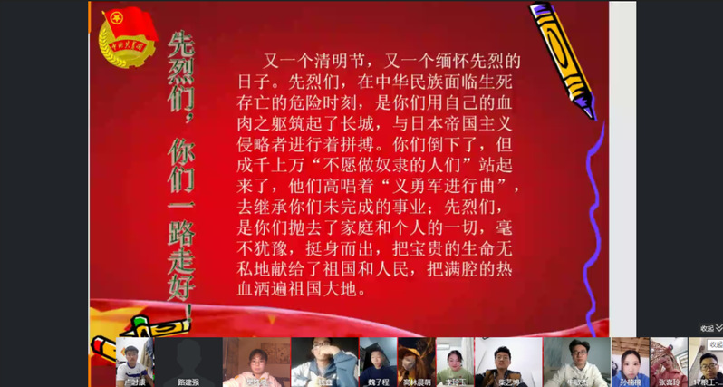 本次活动在牛敏杰同学的演讲下拉开了序幕,他通过PPT向大家讲述了历史上一些革命先烈的英雄事迹,表达了对先烈的深切哀悼和无尽的敬仰之情。牛敏杰还倡议并带领大家向革命先烈们默哀三分钟致敬。随后由李玲玉同学领誓,重温入团誓词,并庄严承诺将努力学习,继承和发扬革命先烈的遗志,为祖国的建设和发展奉献自己的青春和热血。李玲玉表示,我们当代老员工要缅怀革命先烈,传承英雄遗志;铭记历史过去,展望中国未来。最后,纪杨洋老师对本次活动进行了简要的总结,再一次向守护人民安康的英雄们致以崇高敬意与缅怀之情,同时呼吁各位同学注意自身的健康安全,抓好网课学习。