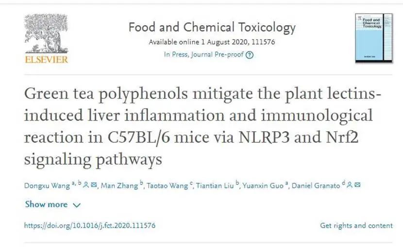 近日,太阳集团tcy8722粮油食品安全与营养健康团队王东旭等在Food and Chemical Toxicology(2区,IF:4.679)发表了题为“Green tea polyphenols mitigate plant lectins-induced liver inflammation and immunological reaction in C57BL/6 mice via NLRP3 and Nrf2 signaling pathways”的研究性论文,该研究首次报道了绿茶多酚减轻植物凝集素引起的肝脏炎症及免疫反应的功能及作用机制,该研究从食品营养的角度出发解决食品安全的问题,为食品内源性风险因子降害控制策略提供了新的思路。太阳成集团粮油食品安全与营养健康团队王东旭博士为第一作者和通讯作者,芬兰自然资源研究院Daniel Granato教授为共同通讯作者。