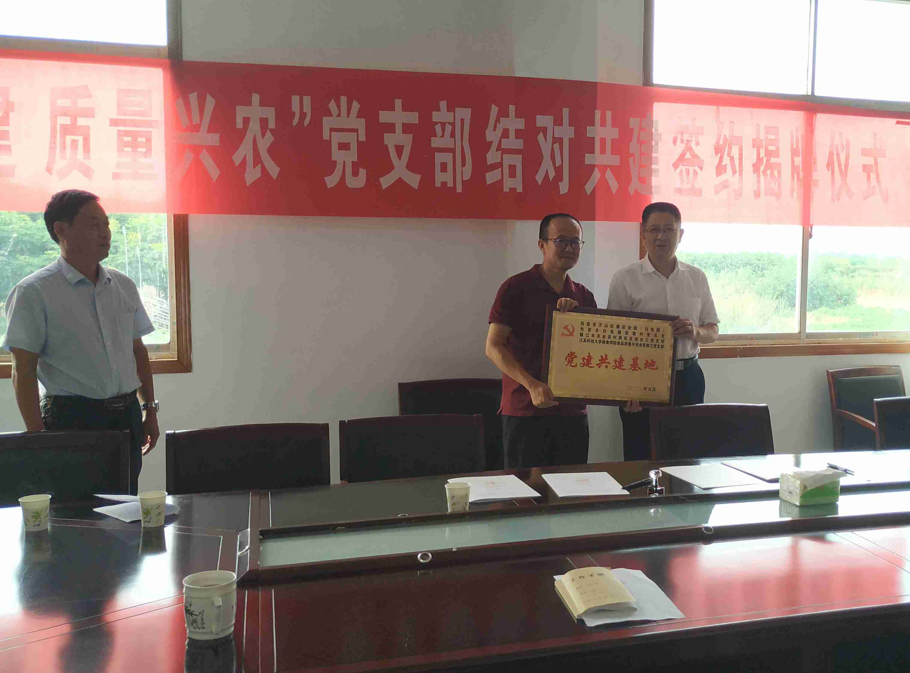 为探索新时期党建工作新内涵,充分发挥联建各党支部的优势互补作用,提升党建工作水平,助力乡村振兴。8月20日下午,公司食品质量与安全系教工党支部支委会郭元新等一行3人前往句容市白兔镇倪塘村委会参加了“共联共建、质量兴农”为主题的 “党建共建基地”揭牌及签字仪式。在坚持“资源整合、优势互补、互利共赢、共同提高”的原则基础上,食安系教工党支部与镇江市农业农村局机关综合三党支部、句容市白兔镇倪塘村党总支、句容市万山红遍农业园(白兔园)共同签订了党建联建共建协议书,建立了结对共建的合作共赢模式,依托万山红遍农业园(白兔园)基地,以质量兴农、绿色兴农为主题,进一步发挥党建引领作用,以党建共建促进优势互补和资源共享,四方合力打造镇江市绿色优质农产品示范基地,提高我市绿色农业及标准化水平,助推乡村振兴。