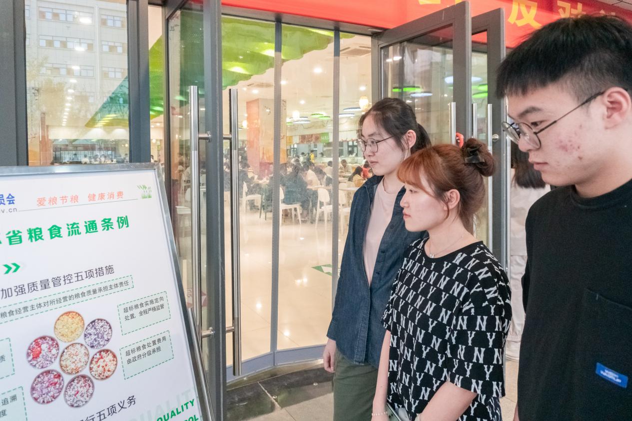 食堂外,00后志愿者们向广大师生发出倡议书,倡导师生做到节约每一粒粮、每一滴水、每一度电,节约每一张纸,使用“公筷公勺”,低碳出行绿色生活,引领节约用餐良好风尚,倡导文明健康生活方式。
