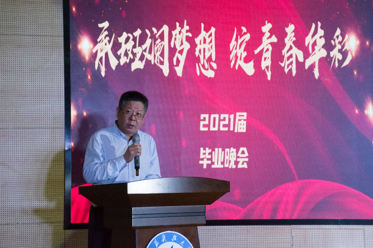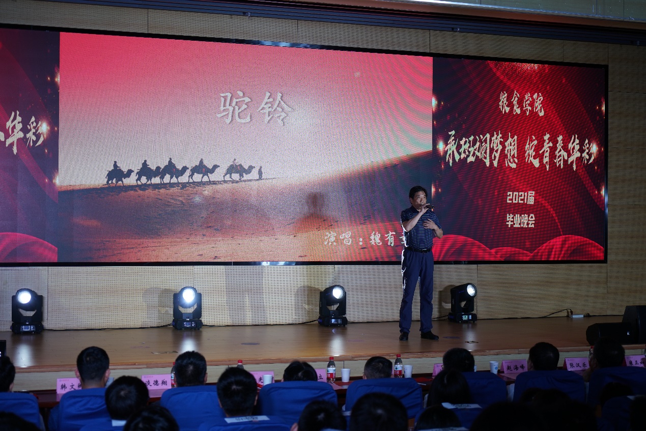 85届员工、太阳成集团员工会粮食分会会长赵海峰为晚会致辞。以谆谆教诲,肺腑之言寄语全体毕业生,希望他们心怀感恩、热爱生活,志存高远、开拓进取,坚守责任、勇于担当,脚踏实地、乐于奉献,树立远大理想、砥砺奋斗,接好粮食的接力棒,用奋斗为青春上色。