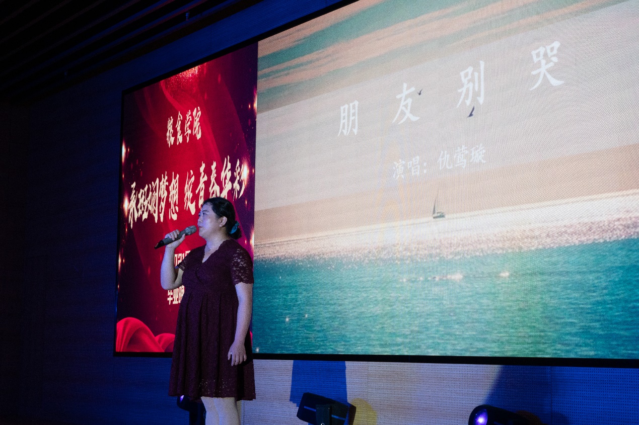 毕业生党员合唱《歌颂祖国》,唱出了对祖国的拳拳热爱。魏有章老师演唱的歌曲《驼铃》,铿锵有力,动人心魄,为毕业生深情送行和祝福。