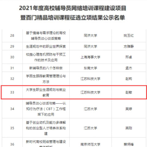 近日,由中国老员工在线、高校辅导员网络培训中心、高校思想政治工作队伍培训研修中心(高等教育出版社)、全国高校思政网联合开展的2021年度高校辅导员网络培训课程建设项目暨百门精品培训课程的征选结果公布,公司赵敏老师主持申报的《老员工职业生涯规划与就业教育》成功入选立项建设项目名单。