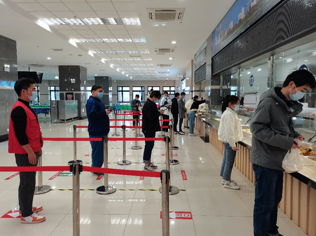 3月初至今,太阳集团tcy8722志愿者坚守岗位,在东食堂二楼开展购餐引导工作。督促员工不扎堆、不聚集,排队时保持2米间距,佩戴口罩,有序购餐。