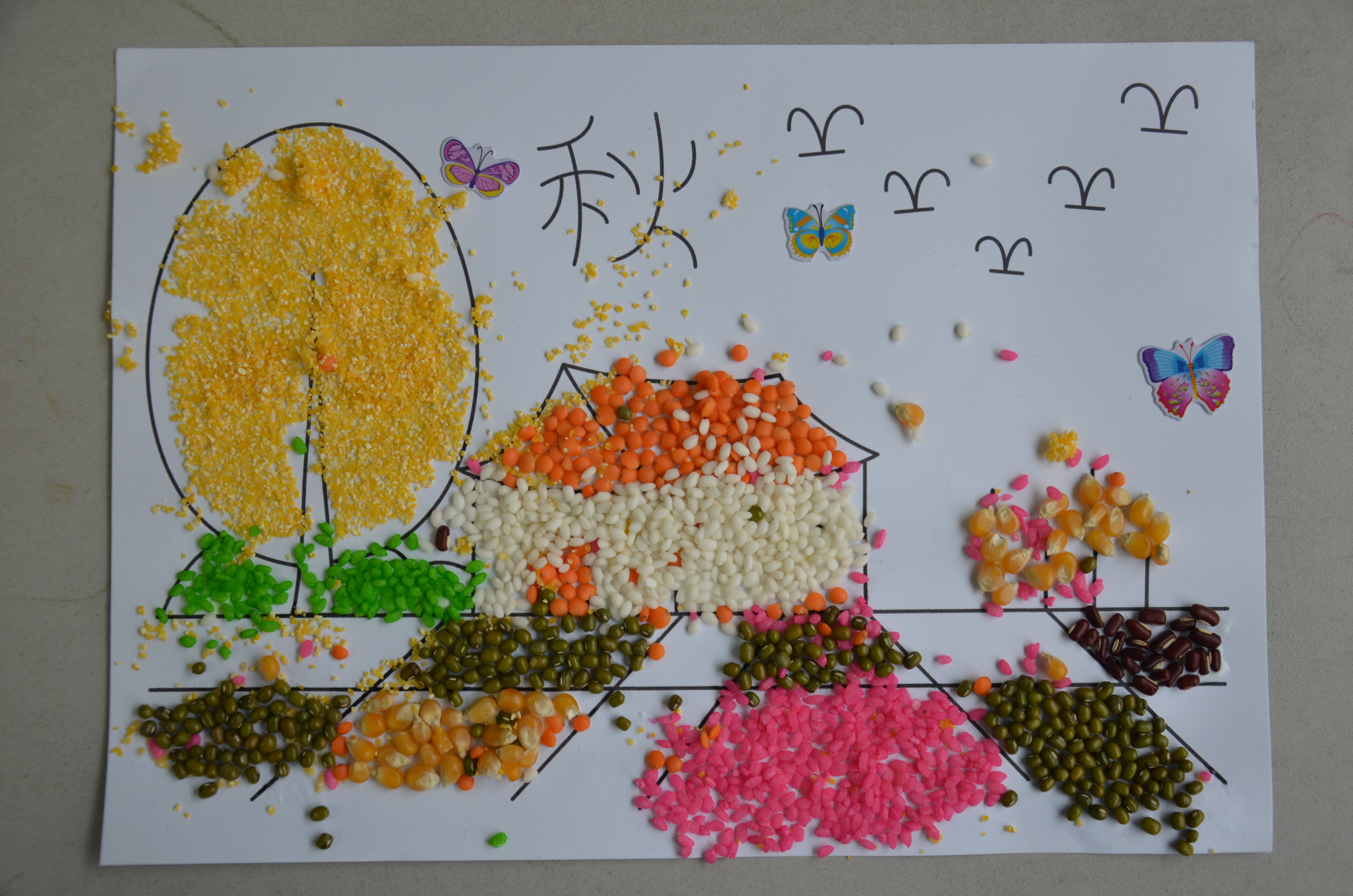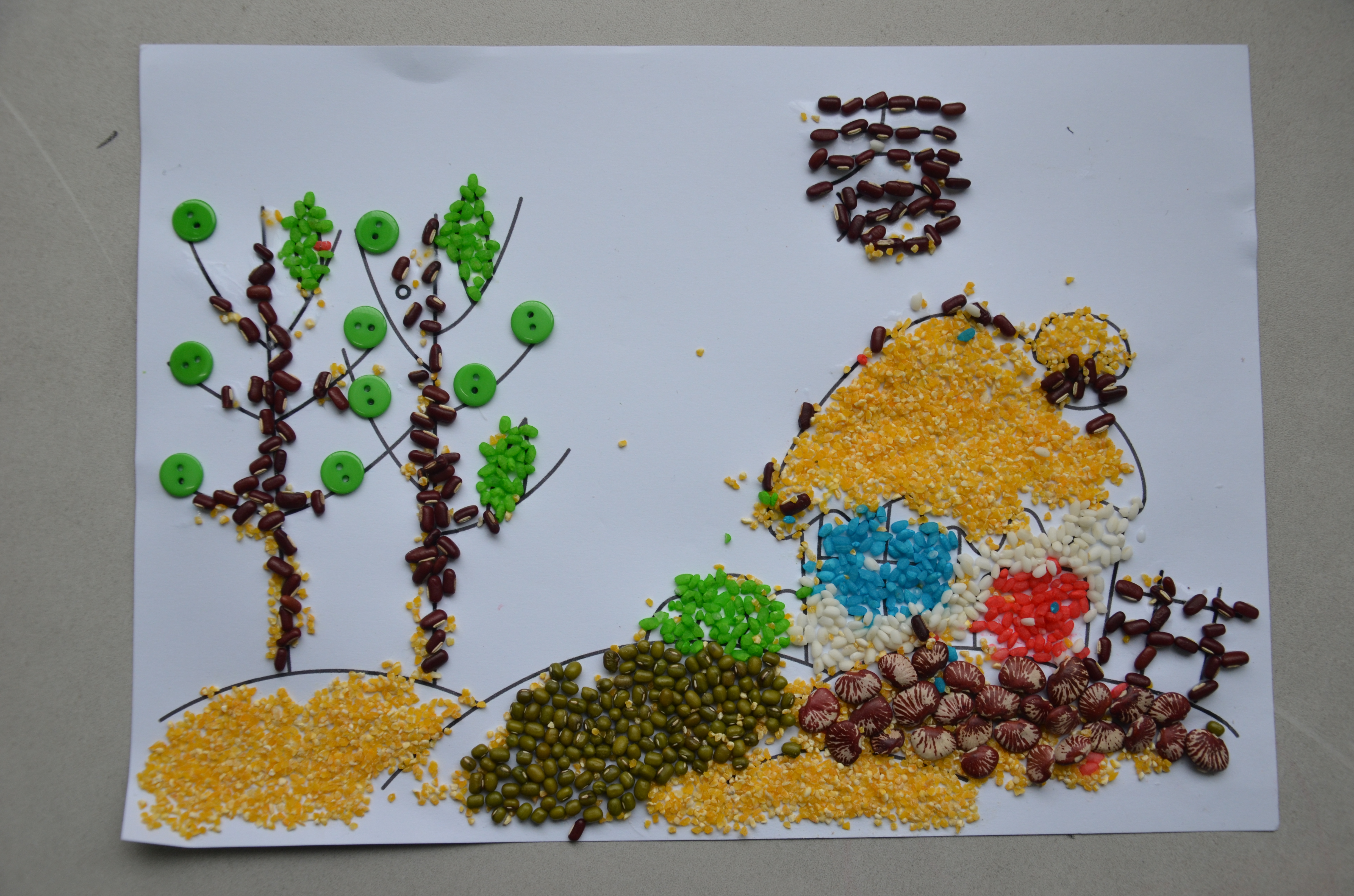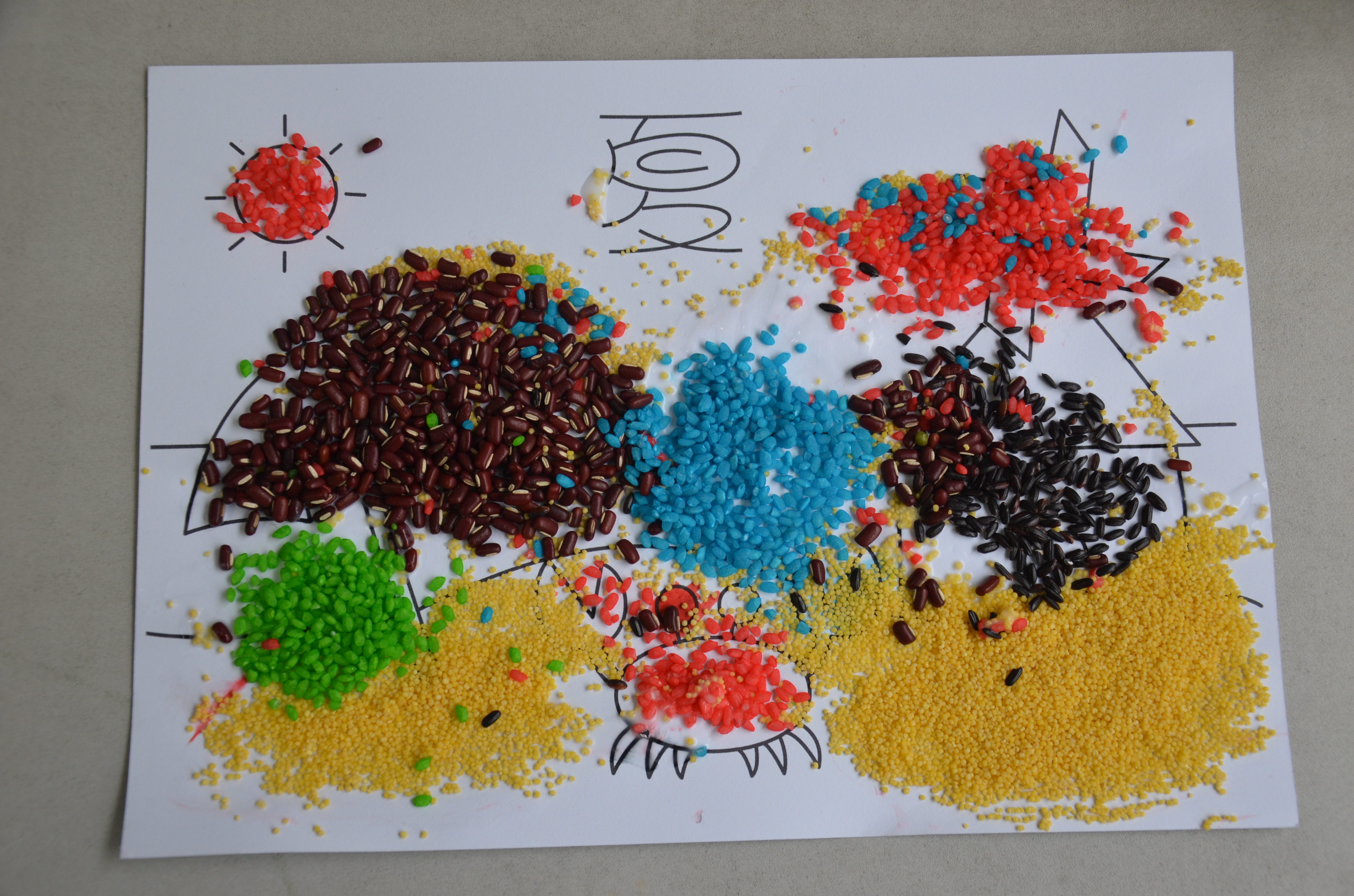 黄豆、红豆、黑豆、绿豆、大米、黑米、玉米……各色各样的粮谷原料在这些小朋友的手下,组成了一幅幅充满了童真幻想、色彩鲜艳的图案。他们的色彩运用来自天性,用五谷展示着孩子们眼中的春夏秋冬。