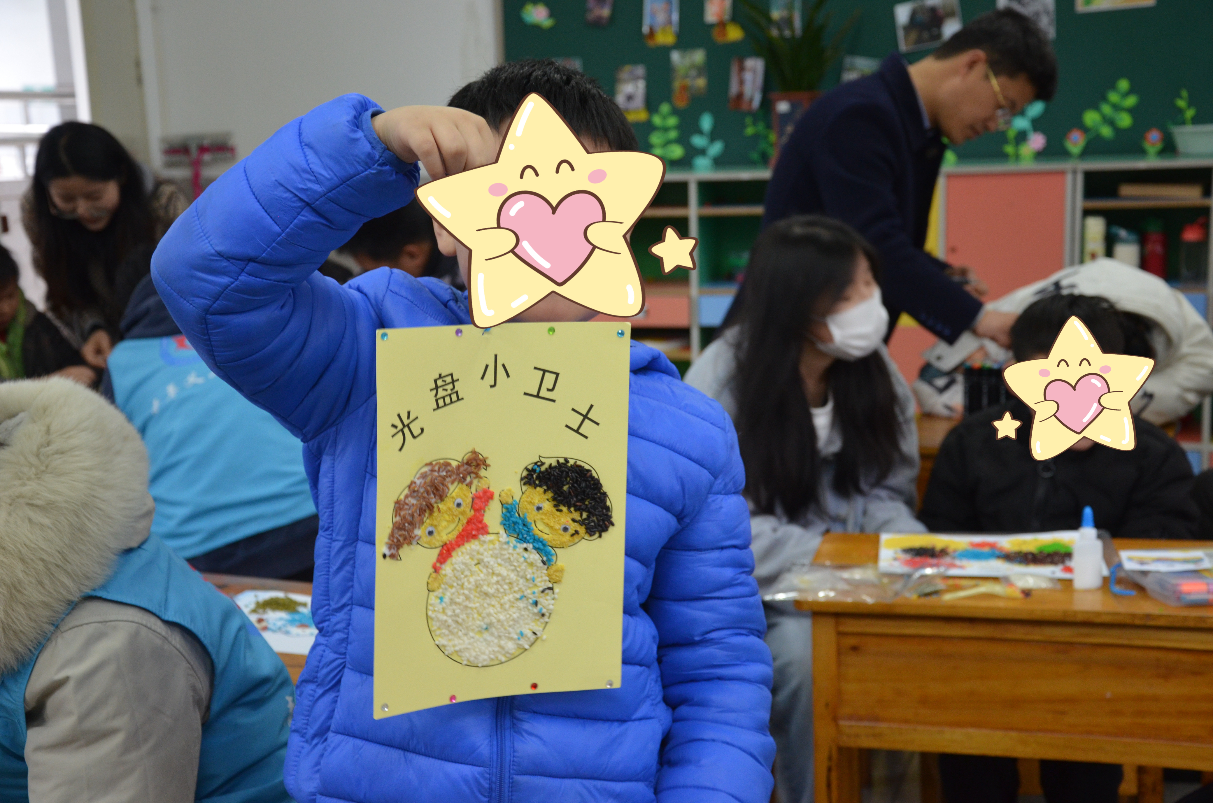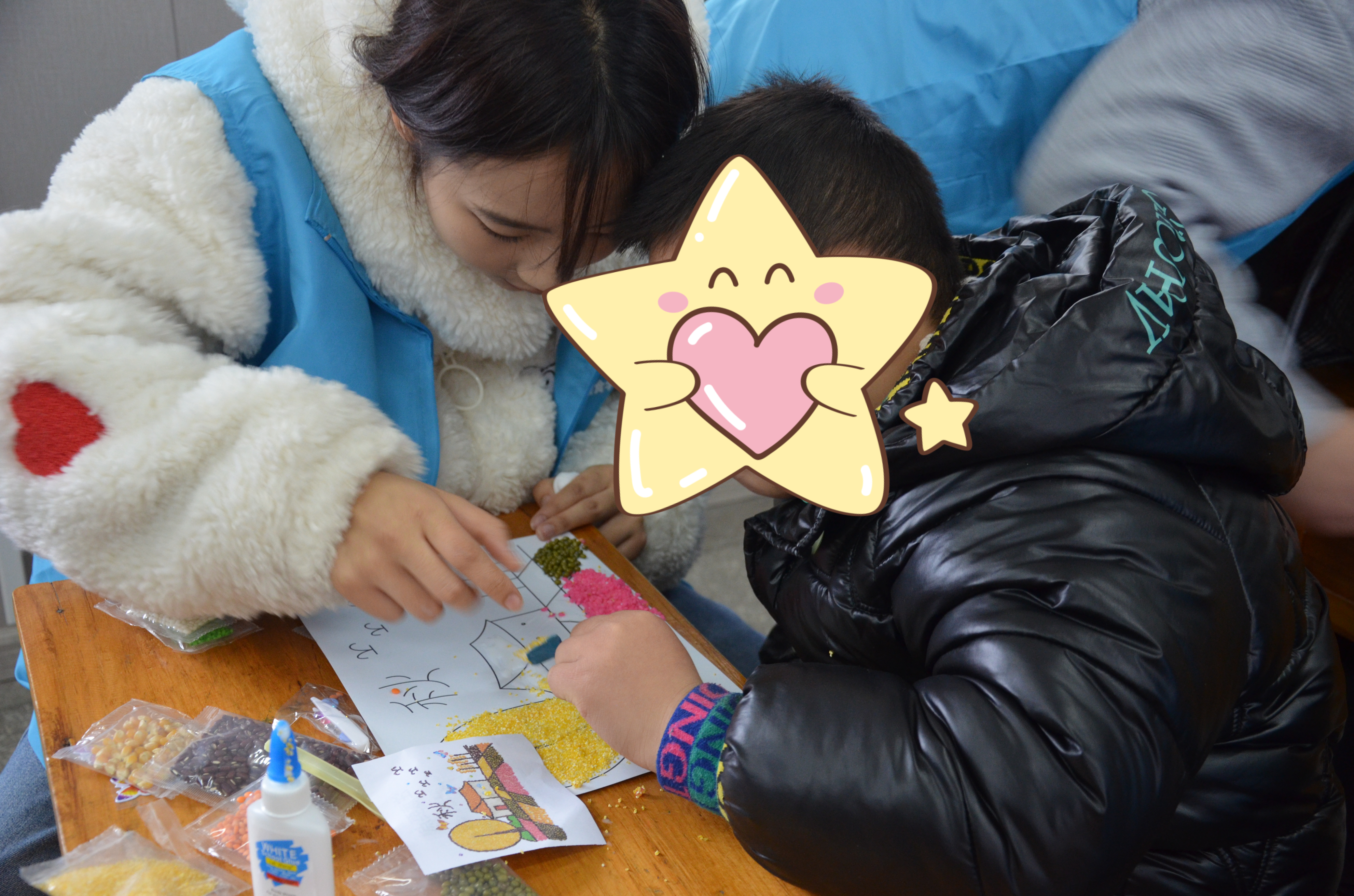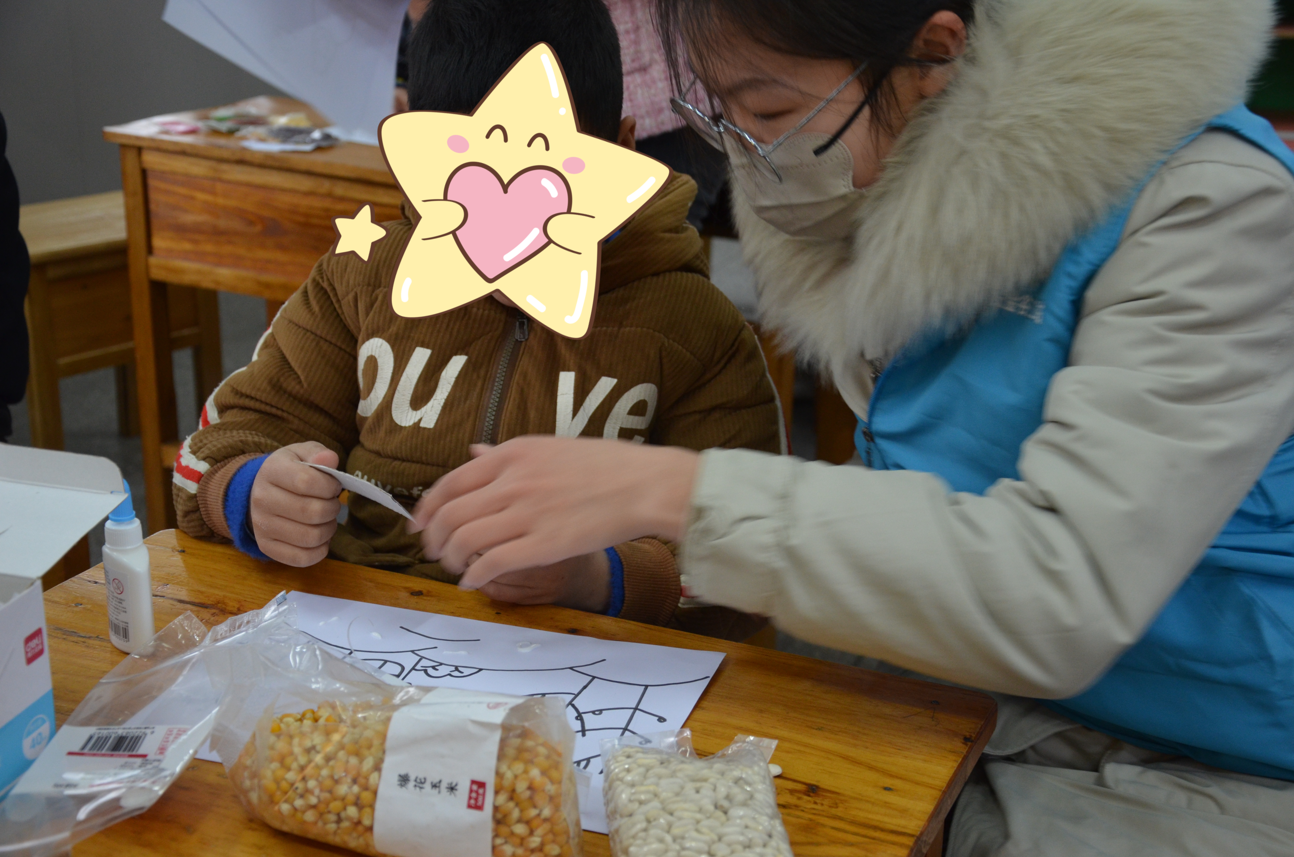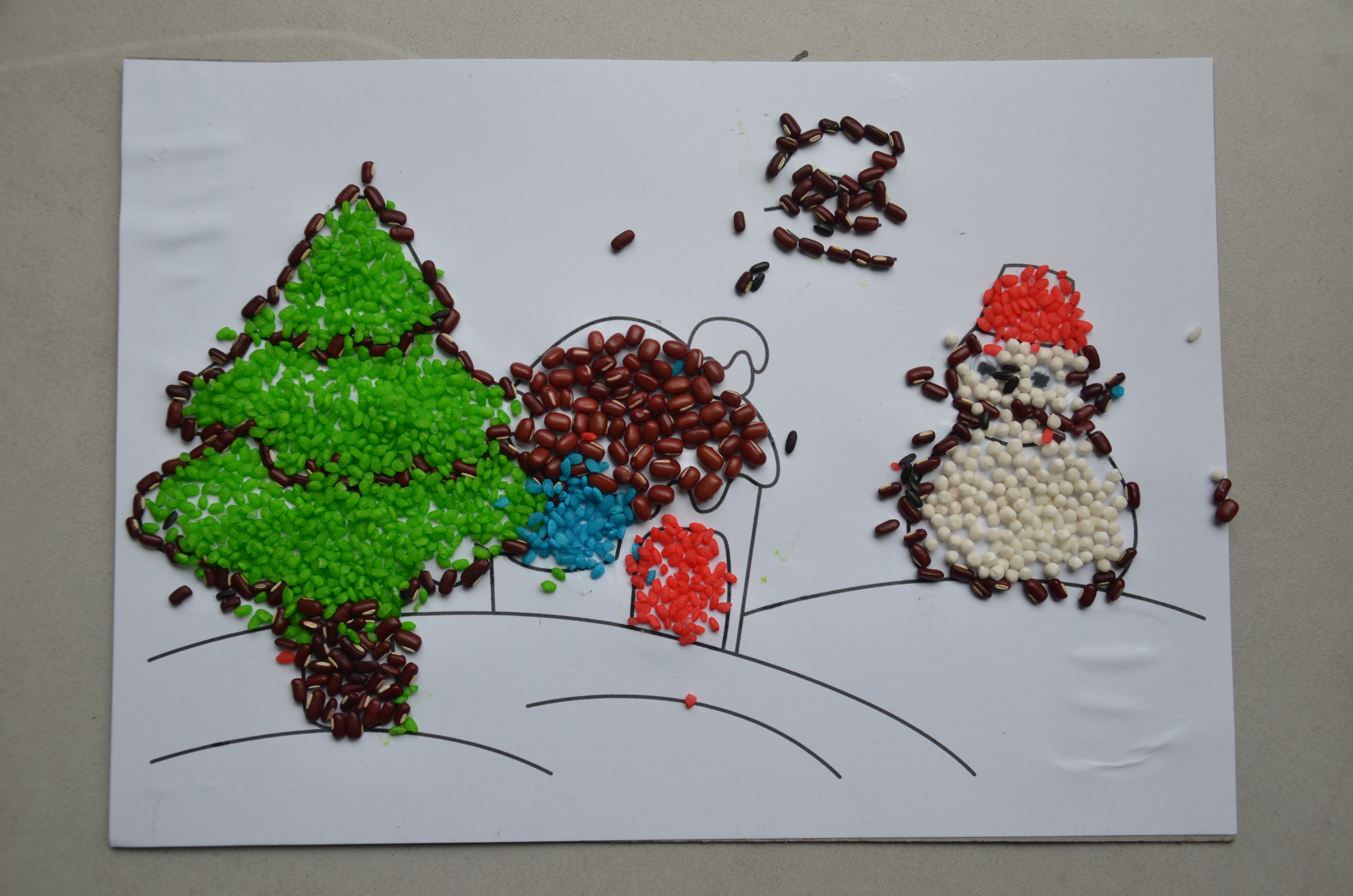 黄豆、红豆、黑豆、绿豆、大米、黑米、玉米……各色各样的粮谷原料在这些小朋友的手下,组成了一幅幅充满了童真幻想、色彩鲜艳的图案。他们的色彩运用来自天性,用五谷展示着孩子们眼中的春夏秋冬。