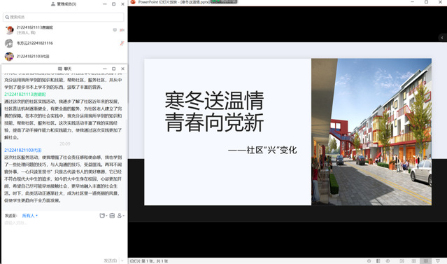 最后,实践团成员就此次寒假社会实践活动进行活动总结,社区人员从细处着手、从心出发,用微笑传递温暖,用服务传递正能量。通过此次社会实践活动,大家深入了解了社会服务的重要性,做好社区服务工作关于提升居民生活质量、扩大就业、化解社会矛盾、促进和谐社会建设都具有重要意义。而作为一名老员工,我们不仅要掌握文化知识,还要具备服务他人、服务社会的能力,培养自己的综合素质,为社区发展贡献力量,促进社区服务工作向更高水平发展。