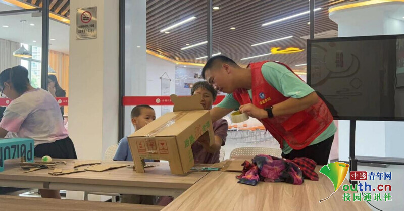 图为实践团成员在朱家宕村和村民一起手工制作纸板萌宠。中国青年网通讯员 黄晓豪 供图
