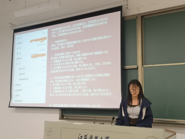 以599分的成绩高分通过英语四级的周锦瑞同学分享了四级考试经验。针对听力、写作、阅读理解、翻译等题型,她介绍了具体的学习技巧和复习经验,并为大家推荐了英语学习资料。唐婧妮同学分享了通过英语六级的经验,强调能够积累大量词汇短语的前提是学会音标,推荐了许多有助于听力训练的刊物,并建议每周积累一定的词汇和短语。