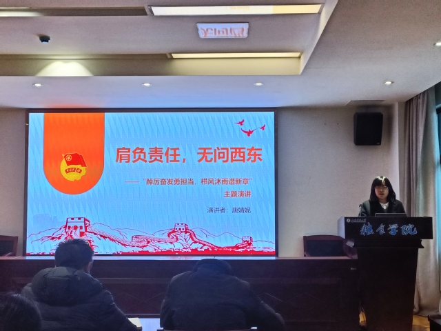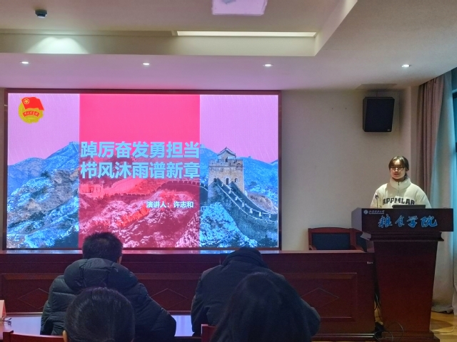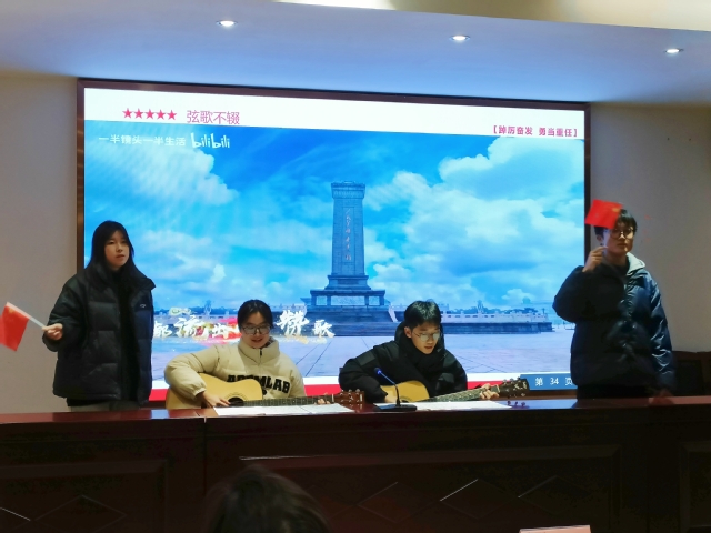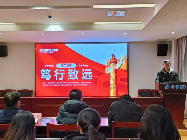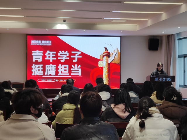 团课以“挺膺担当”为主题,分为“党史知识你划我猜”、团支书领学、“踔厉奋发勇担当栉风沐雨谱新篇”主题演讲、员工代表发言、《我和我的祖国》小合唱五个环节。在“你划我猜”环节,同学们在趣味答题中增进了对于党史知识的了解;团支书朱玙颉领学习近平总书记关于青年工作的重要论述、重要讲话,引导同学们要树立远大理想、热爱伟大祖国、担当时代责任、勇于砥砺奋斗、练就过硬本领、锤炼品德修为;两名同学从“天下兴亡匹夫有责”到“未来属于青年希望寄予青年”,从“小小红船”到“巍巍巨轮”慷慨激昂的演讲,表达了青年要挺膺担当、砥砺奋斗的决心;三名员工代表结合自身学习生活经历、未来发展规划汇报了参加此次团课的学习收获和心得体会;同学们在《我和我的祖国》歌声中,挥动国旗,感悟挺膺担当。