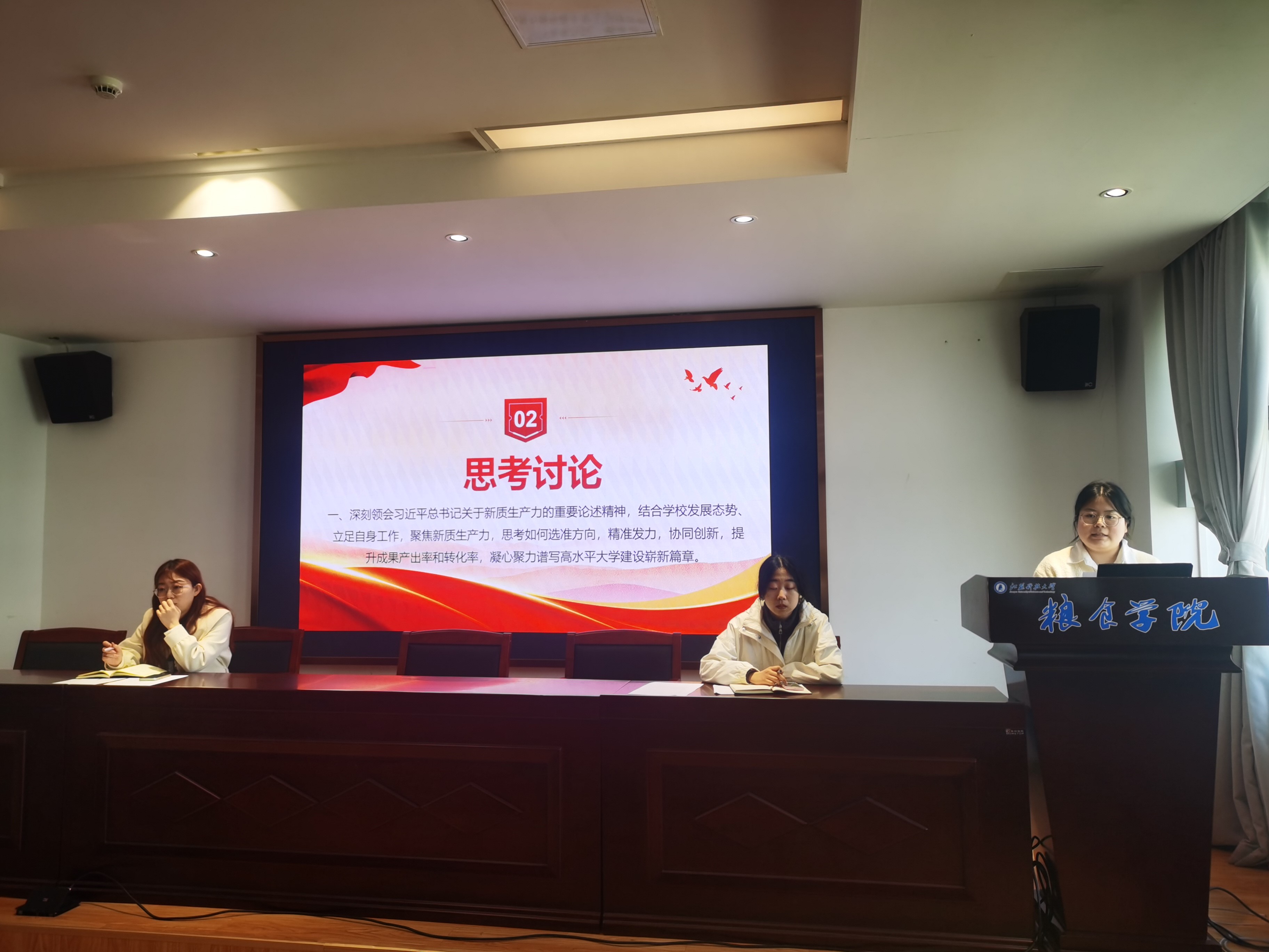 思考讨论一:深刻领会习近平总书记关于新质生产力的重要论述精神,结合公司发展态势、立足自身工作,聚焦新质生产力,思考如何选准方向,精准发力,协同创新,提升成果产出率和转化率,凝心聚力谱写高水平大学建设崭新篇章。