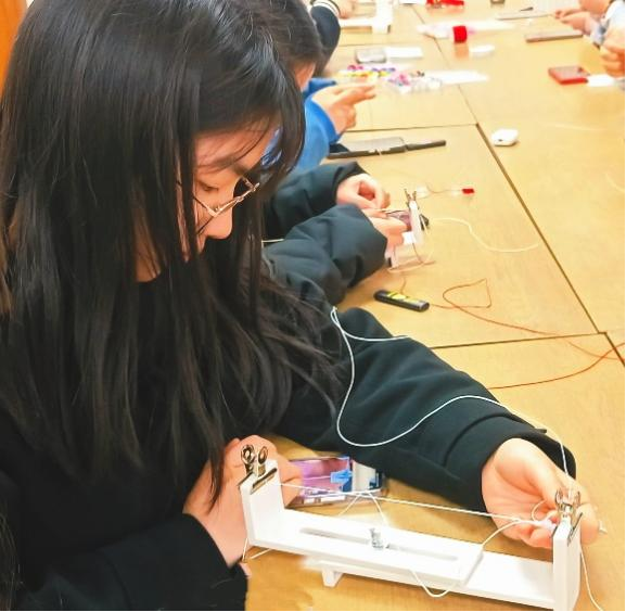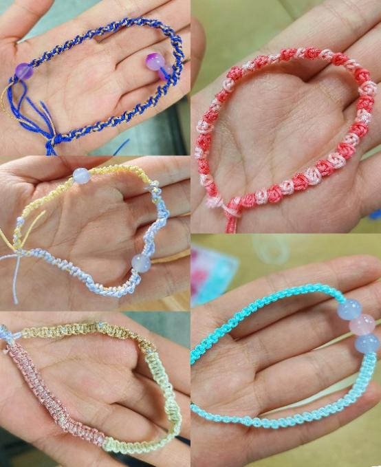 制作期间,同学们都非常积极好学,遇到问题相互探讨,给同伴编织建议,气氛十分融洽。根据工作人员的指导,同学们逐渐掌握了制作方法,充分发挥动手能力,编织、串珠、固定,全神贯注地打造着一件件精美别致的“私人订制”饰品。以手造物,以物抵心。美妙的时光在指尖悄悄流淌,手串制作活动到了尾声,大家满怀欣喜展示自己的作品,意犹未尽的拍照记录。