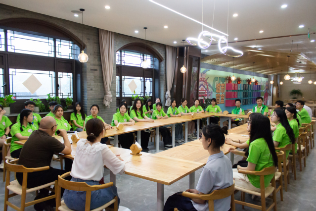 图为营员在中储粮镇江质检中心聆听储粮发展