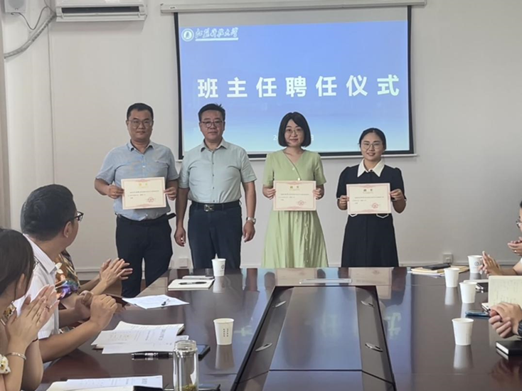 前期,经公司教师个人自荐、系部推荐、公司讨论,确定了2023级、2024级共9名本科生班主任名单。会上,梁忠臣书记为新聘任的班主任颁发聘书。喻永光副书记介绍班主任主要工作职责,强调班主任应做好员工的学业发展指导、班级日常管理、心理健康关注、熟悉员工情况等内容,并对具体职责进行量化规定,促进班主任发挥有效作用。辅导员赵亚冉对2023级员工作基本情况介绍,包括学业成绩、挂科情况、英语四六级考试通过情况、重点关注员工等。最后,梁忠臣书记对班主任如何管理员工、参与员工培养、促进员工发展等方面提出了要求和建议。