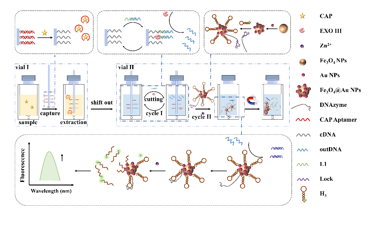 在此研究策略中,以表面修饰核酸序列的石英棒构建固相微萃取体系将分析物的识别捕获、浓缩富集和检测引入过程集合为一体,极大简化了样品前处理操作;通过石英棒基质与DNA酶循环剪切体系间的相互作用,将对氯霉素的检测转化为对特定核酸序列的检测,并进行第一次核酸序列的扩增;通过在第四代传感器—DNA步行机纳米粒子表面进行核酸恒温扩增的操作,对检测信号进行了第二次扩增。
