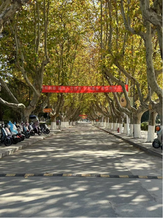 校园道路两旁,高大的梧桐树撑开金色的华盖。秋风拂过,巴掌大的叶子沙沙作响,阳光透过枝叶间隙,洒下斑驳光影。