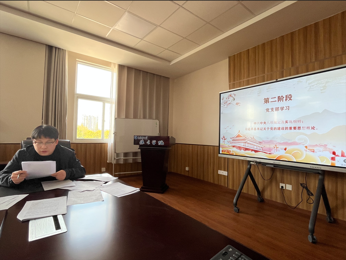 党支部学习阶段,支部书记关桦楠领学《中央八项规定及实施细则》第一部分内容,对八项规定具体内容做重点领学和解读,共三十条,包括改进调查研究、精简会议活动和文件简报、规范出访活动、改进新闻报道、加强督促检查五个方面的详细内容。