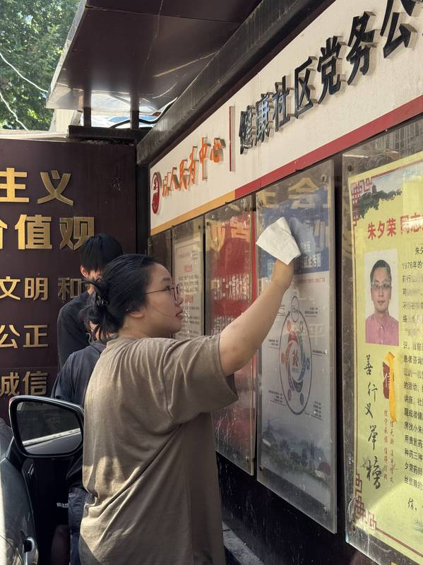 首先,实践团成员携带扫帚、抹布、垃圾袋等清洁工具,对社区内的公共区域进行了全面清扫。他们不怕脏、不怕累,认真清理了道路两旁的落叶、楼道内的杂物以及卫生死角的垃圾还有社区宣传栏。在清理过程中,成员们还积极向社区居民宣传环保知识,倡导大家共同维护社区环境卫生,不少居民也主动加入到清扫队伍中。经过大家的共同努力,社区环境焕然一新,道路变得整洁干净,楼道也更加通畅明亮。