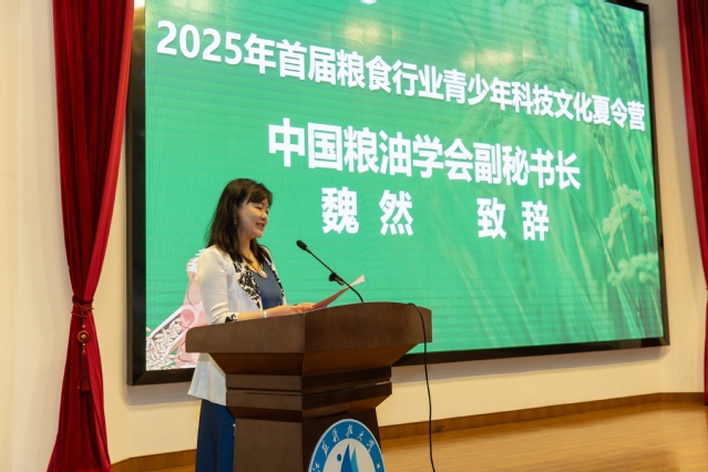 中国粮油学会副秘书长魏然代表业务指导单位讲话。她强调,“粮食安全是‘国之大者’,青年学子要胸怀国之大者,在行走中感悟粮食安全的厚重根基。”她指出,本次三城联动的研学设计(镇江-杭州-南京),正是为了让青年“在江河奔流处读懂农耕文明,在创新高地中领略科技伟力”。