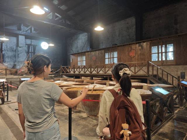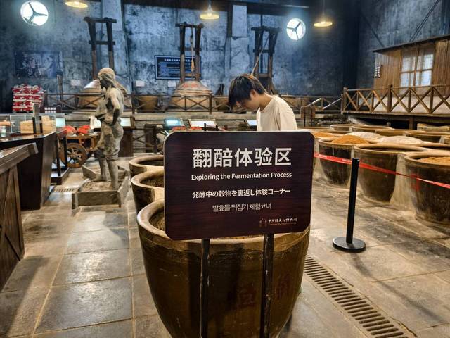 在讲解员的介绍下,实践团成员们了解了镇江香醋古法酿造的复杂制作过程。其制作工艺独特,需经历制酒、制醅、淋醋三大流程,包含 40 多道工序。从糯米筛选到陈酿,国家级非遗固态分层发酵技艺的每个细节都彰显着匠人精神。实践团成员们亲身体验传统制作工艺,从原料筛选到陈酿,每个环节都让他们对传统的香醋制成工艺有了更深理解。