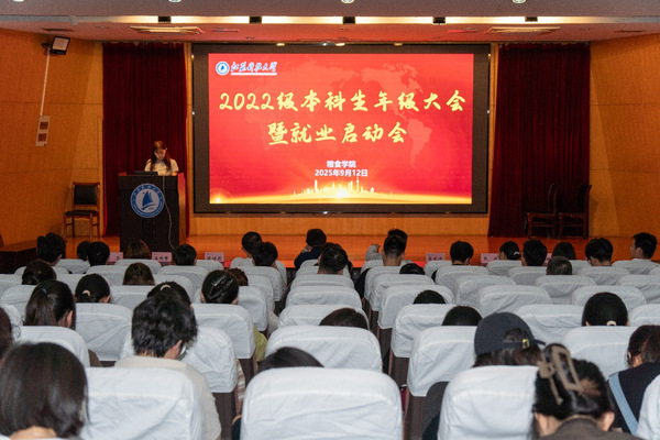 大会最后,鲁玉杰经理上台作总结发言,为在场2022 级毕业生带来就业激励与毕业寄语。鲁经理围绕“机遇与挑战并存” 的核心观点,结合粮食行业发展趋势与当前就业市场特点分析:“当前,国家对粮食安全高度重视,粮食贸易、仓储物流、质量监管等领域迎来新的发展机遇,对专业人才的需求持续增长;但同时,就业市场竞争也在不断加剧,对毕业生的综合能力要求更高,这既是挑战,也是大家提升自我的动力。”